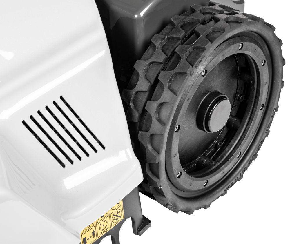 Gumowy bieżnik zapewnia lepszą przyczepność na trawie, a ochrona IPx5 zabezpiecza robota przed wodą, co jest szczególnie przydatne podczas pracy w wilgotnych warunkach.