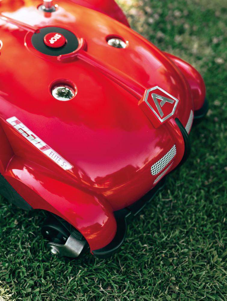 Opatentowane, samoskrętne przednie koła oraz miękkie, gumowe tylne koła zapewniają świetną przyczepność na każdym terenie, również na mokrej trawie, co dodatkowo zwiększa efektywność i stabilność robota.